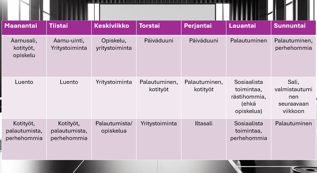 Kuva näyttää selkeältä ja toimivalta, mutta pienikin muutos tai ongelma, vaikkapa huonosti nukuttu yö, sotki suunnitelman kokonaan. Sen lisäksi päivätyön ollessa vuorotyötä, viikkosuunnitelmat tuli tehdä vuorolistan mukaan. Opiskeluille ei myöskään jäänyt paljoa aikaa, joka aiheutti rästejä ja lisästressiä. Siirtymiin kului viikossa keskimäärin 10–11 tuntia. Hurjimpina viikkoina yli 20 tuntia. Tämä siis auton kanssa.