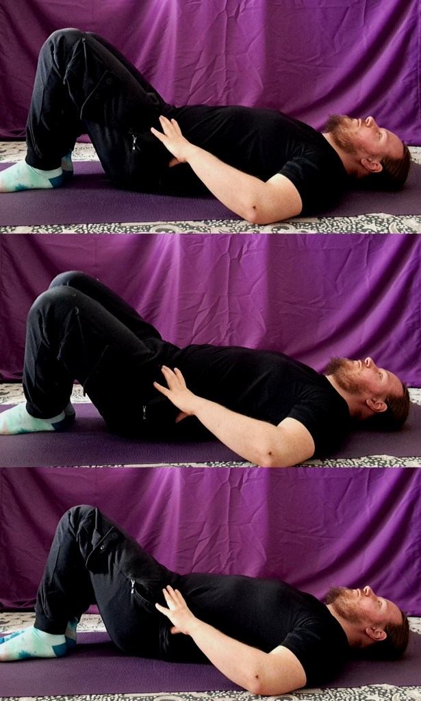- Asetu selälleen lattialle ja nosta jalat koukkuun. Polvia voi heijata hieman sivuille pienellä liikkeellä. Ajatuksena on tuottaa pientä pumppaavaa liikettä alaselän alueelle.